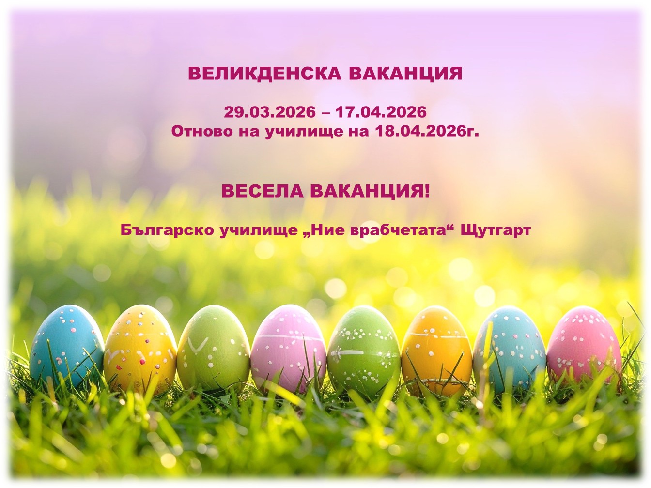 29.03.2026 – 17.04.2026 Отново на училище на 18.04.2026г. ВЕСЕЛА ВАКАНЦИЯ!Българско училище„Ние врабчетата“ Щутгарт